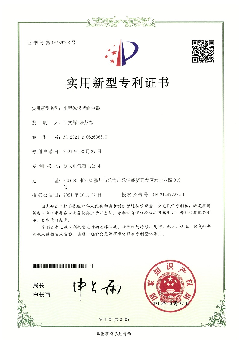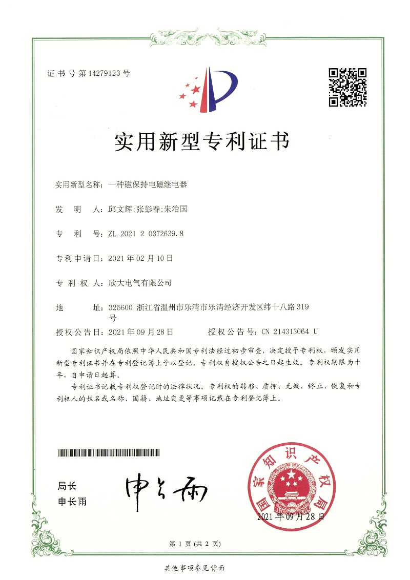 [專利證書]采用柔性動簧片的磁保持電磁繼電器(實用)