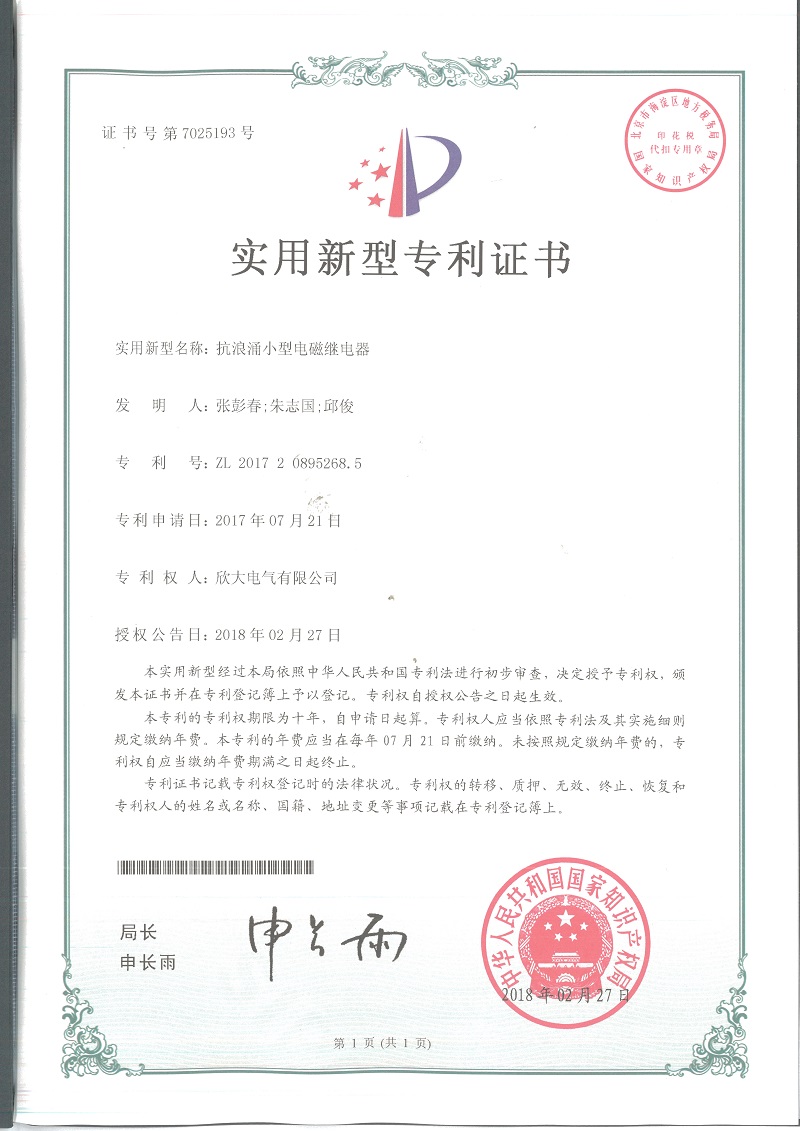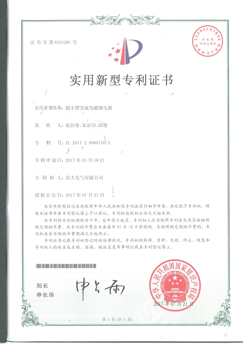 [專利證書]抗浪涌小型電磁繼電器(實用)