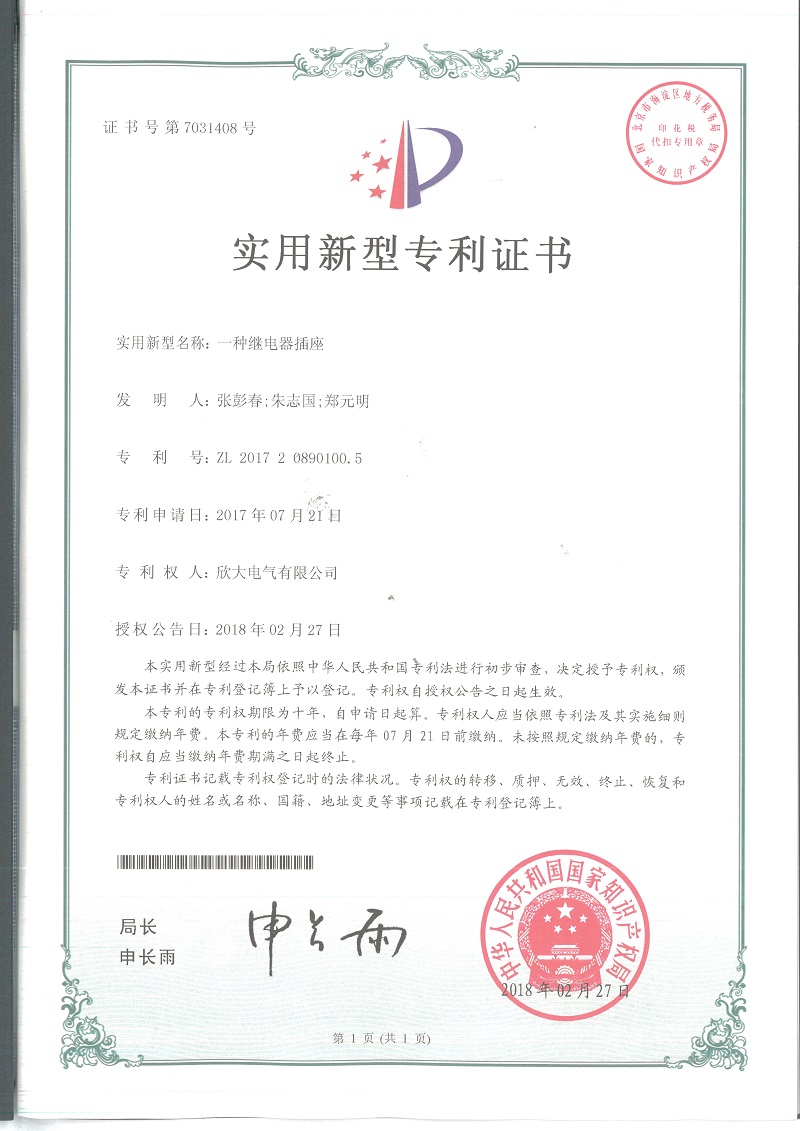 [專利證書]一種繼電器插座(實用)