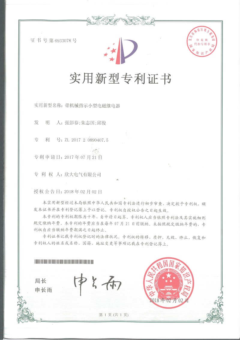 [專利證書]帶機械指示小型電磁繼電器(實用)