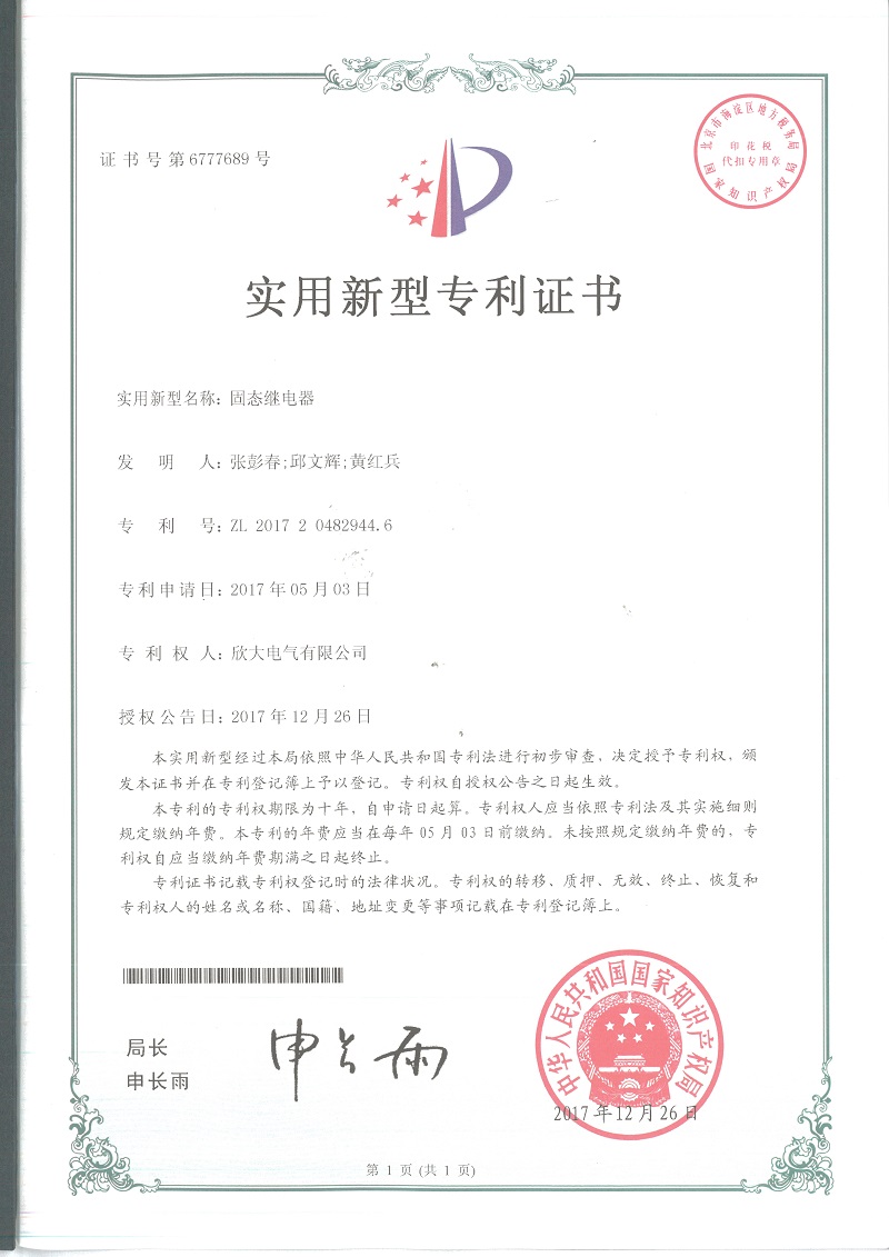 [專利證書]一種超薄型固體繼電器(實用)