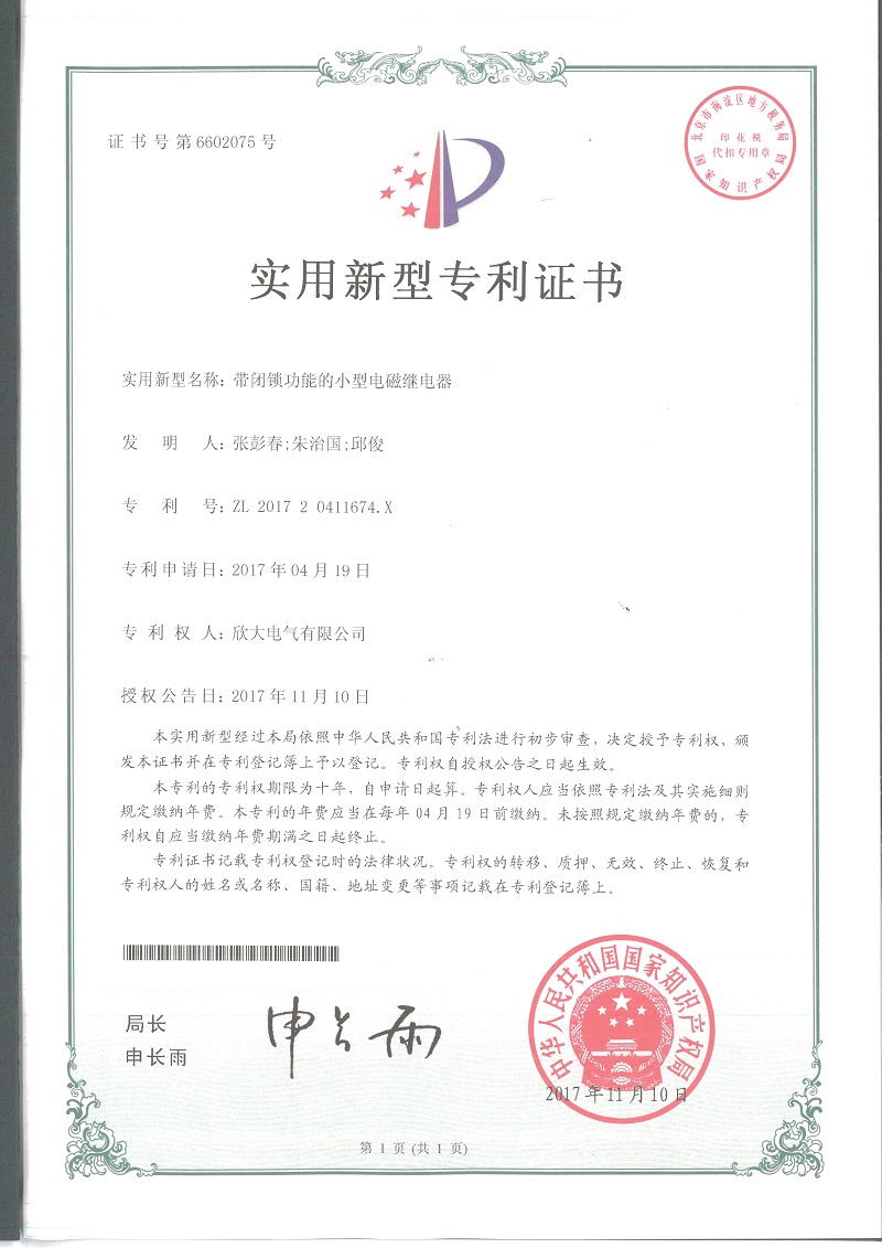 [專利證書]帶閉鎖功能的小型電磁繼電器(實用)