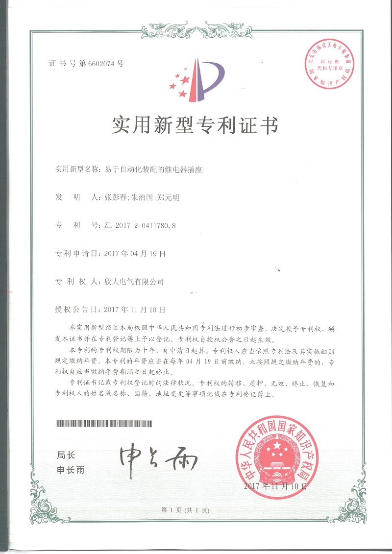 [專利證書]易于自動化裝配的繼電器插座(實用)
