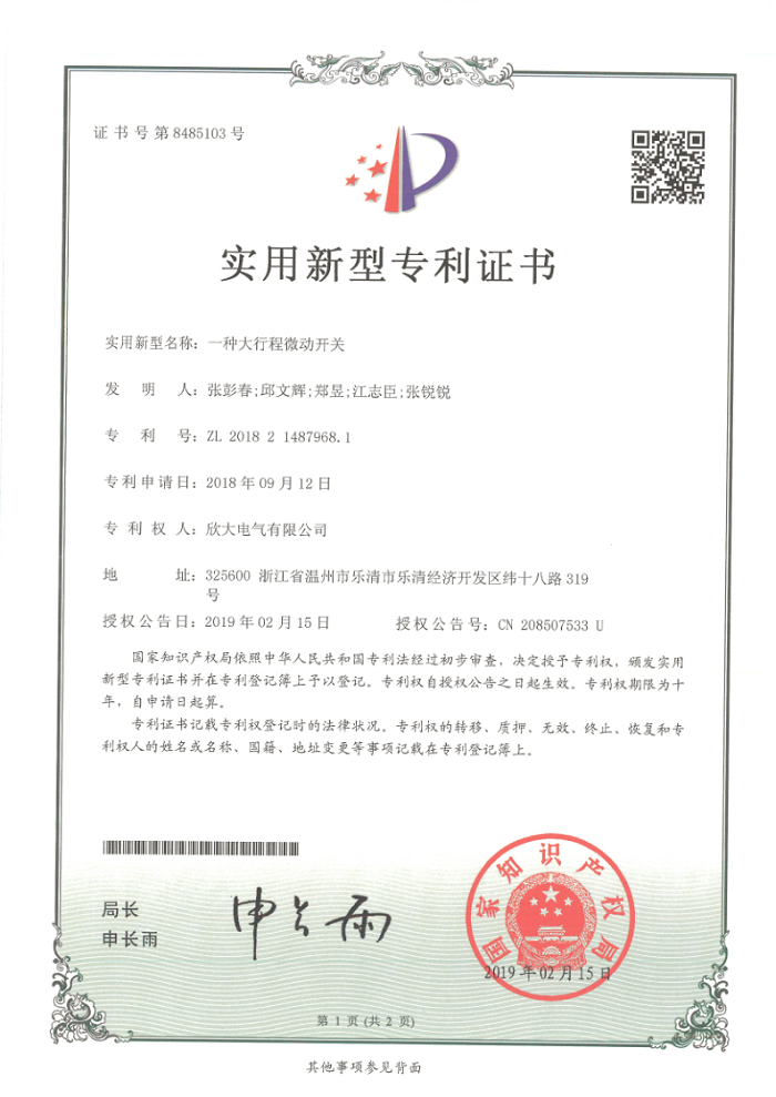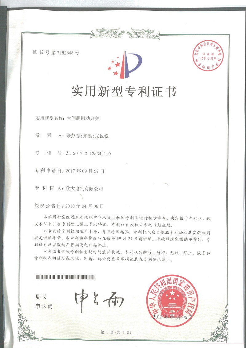 [專利證書]一種大行程微動開關(實用)