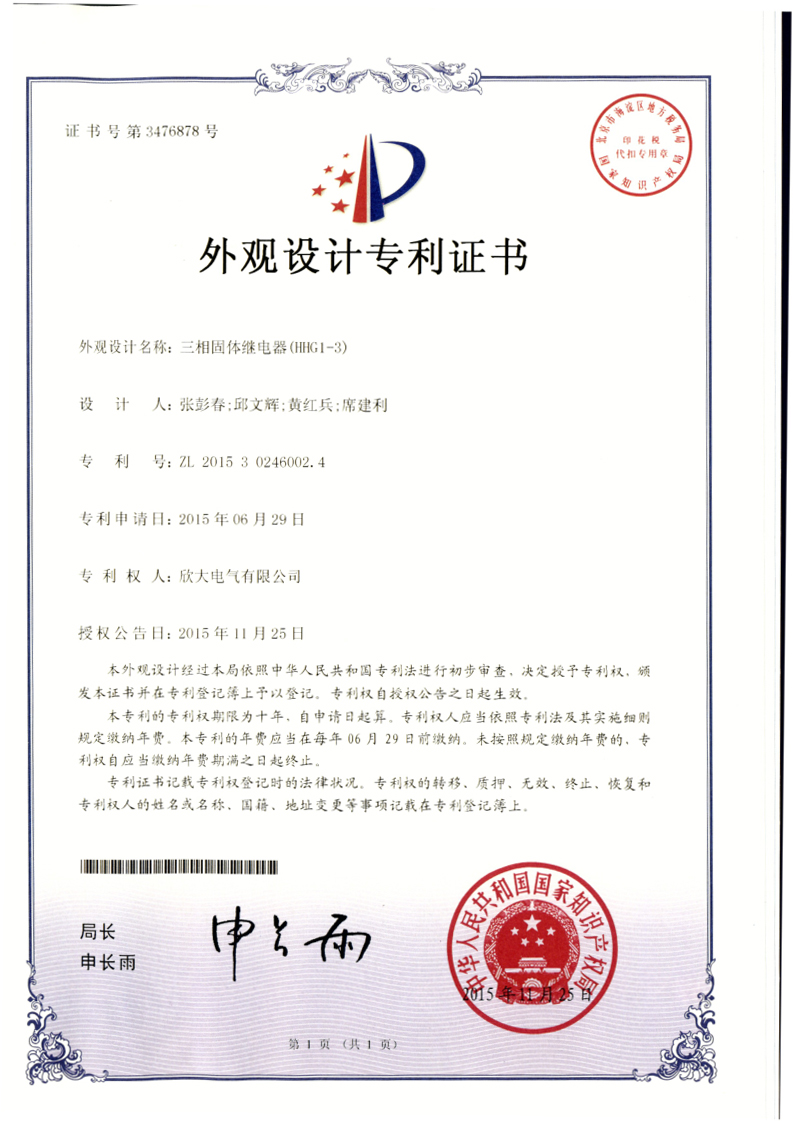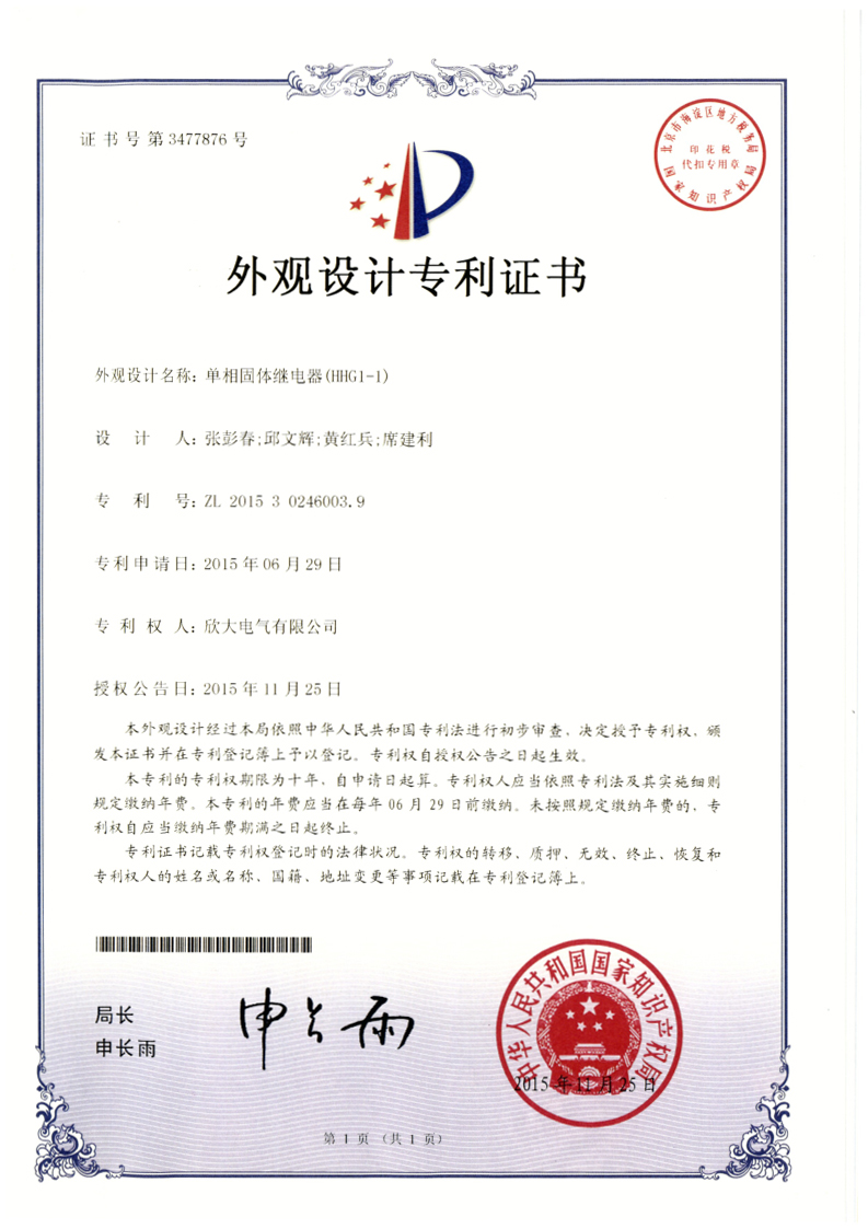 [專利證書]單相固體繼電器(HHG1-1)(外觀)