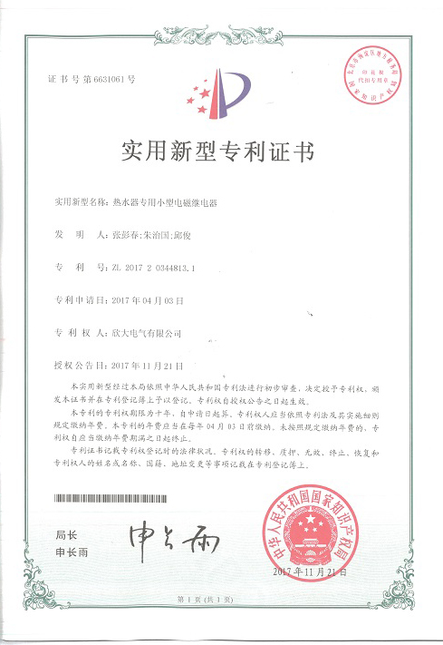[專利證書]熱水器專用小型電磁繼電器(實用)
