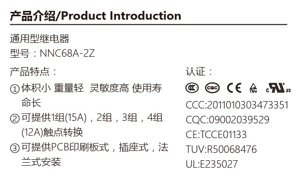 - 欣大電氣NNC68A(JQX-13F-2Z, LY2)系列通用電磁繼電器采用無塵車間加工技術及自動化生產線,選材精良,優質銀合金觸點,上等銅材,符合ROHS標準的元器件及原材料,國際標準尺寸及安裝方式,具有高容量,靈敏度強,耐久性好,內部防塵,壽命長等優點,廣泛應用于家用電器,PCB線路板,工業控制系統,自動化控制系統等領域。