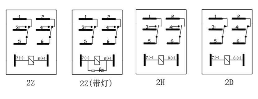 ⑤ 觸點形式:2H= 2組常開型 H; 2D= 2組常閉型 D; 2Z= 2組轉換型 Z