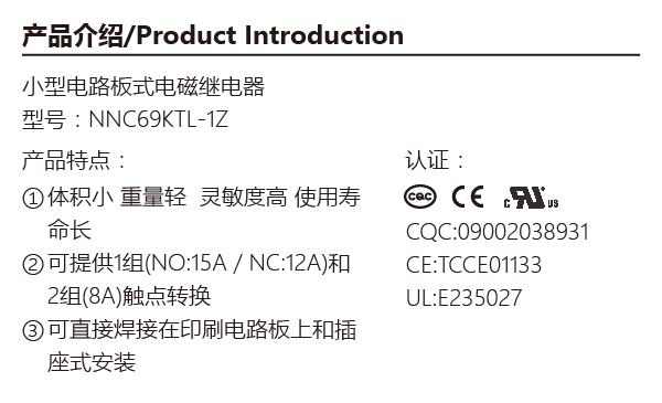 - 欣大電氣NNC69KTL 1Z 15A系列小型線路板式電磁繼電器結合無塵車間加工技術及全自動化生產線,選用優質銀合金觸點,上等銅材,符合ROHS標準的元器件及原材料,國際標準尺寸及安裝方式,具有高容量,靈敏度強,耐久性好,內部防塵,壽命長等優點,廣泛應用于家用電器,PCB線路板,工業控制系統,自動化控制系統等領域。
