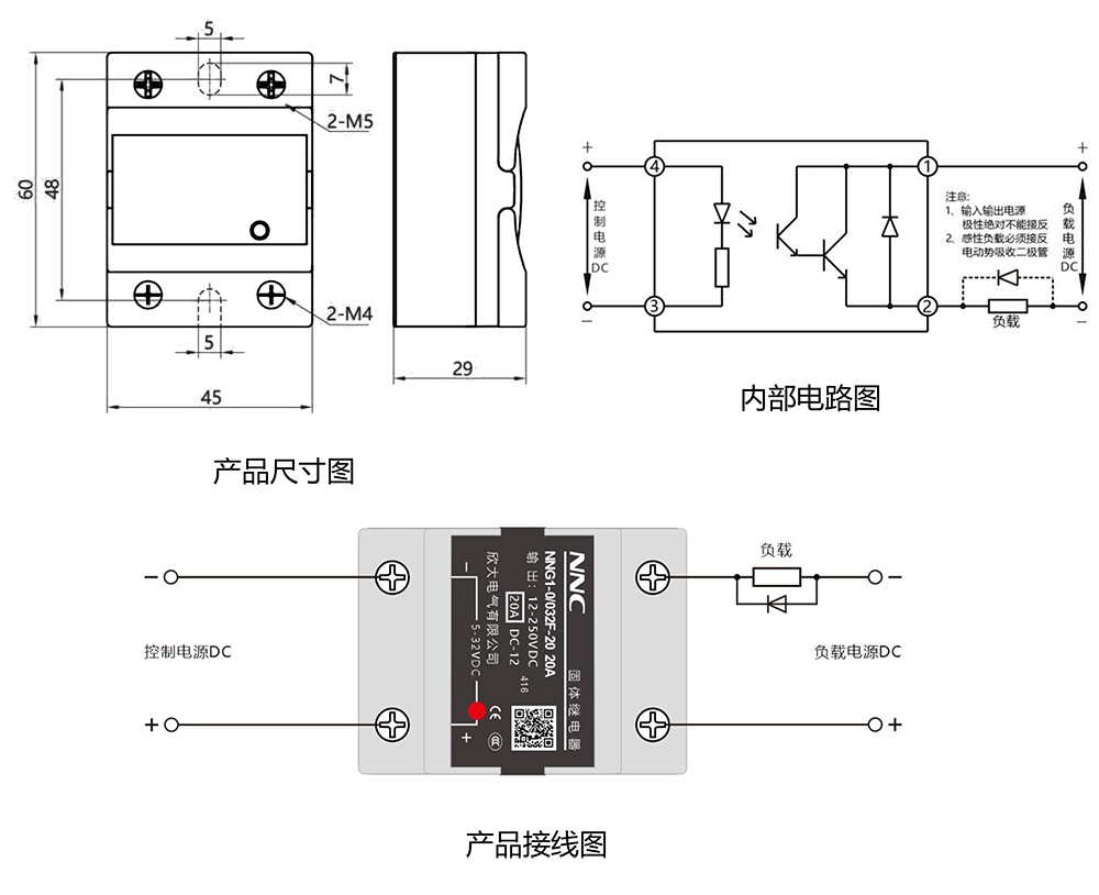 產品技術參數控制電壓 3-32VDC 控制電流 10-45mA 接通電壓 5VDC 關斷電壓 1VDC 反向電壓 32VDC 負載電壓 12-250VDC 負載電流 10A、15A、20A、25A、30A、40A、60A