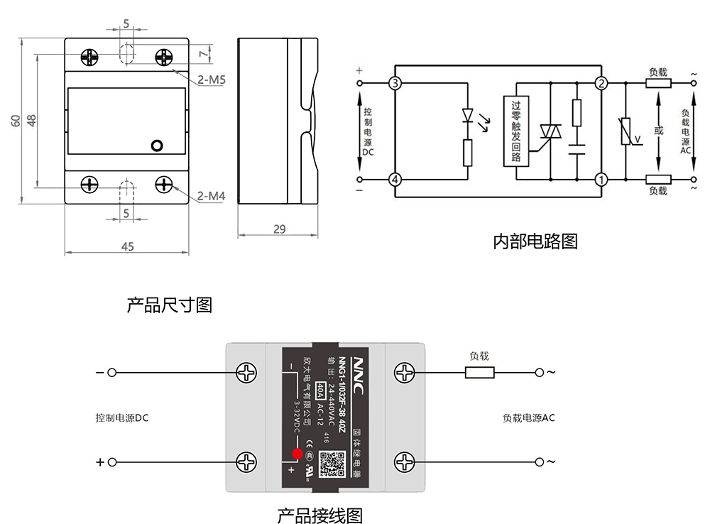 瞬態電壓 22:600VAC 38:900VAC 通態壓降 ≤1.6VDC 通斷時間 ≤10ms 斷態漏電流 ≤10mA 介質耐壓 ≥2500VAC 絕緣電阻 100MΩ,500VDC 測試 環境溫度 -30~80℃ 安裝形式 螺栓安裝 產品重量 10-40A≈95g、60-100A≈100g 外形尺寸 60×45×29mm 說明 負載5A 以上必須安裝散熱器,60℃以上必須加風扇強冷或者水冷 產品尺寸及接線方式