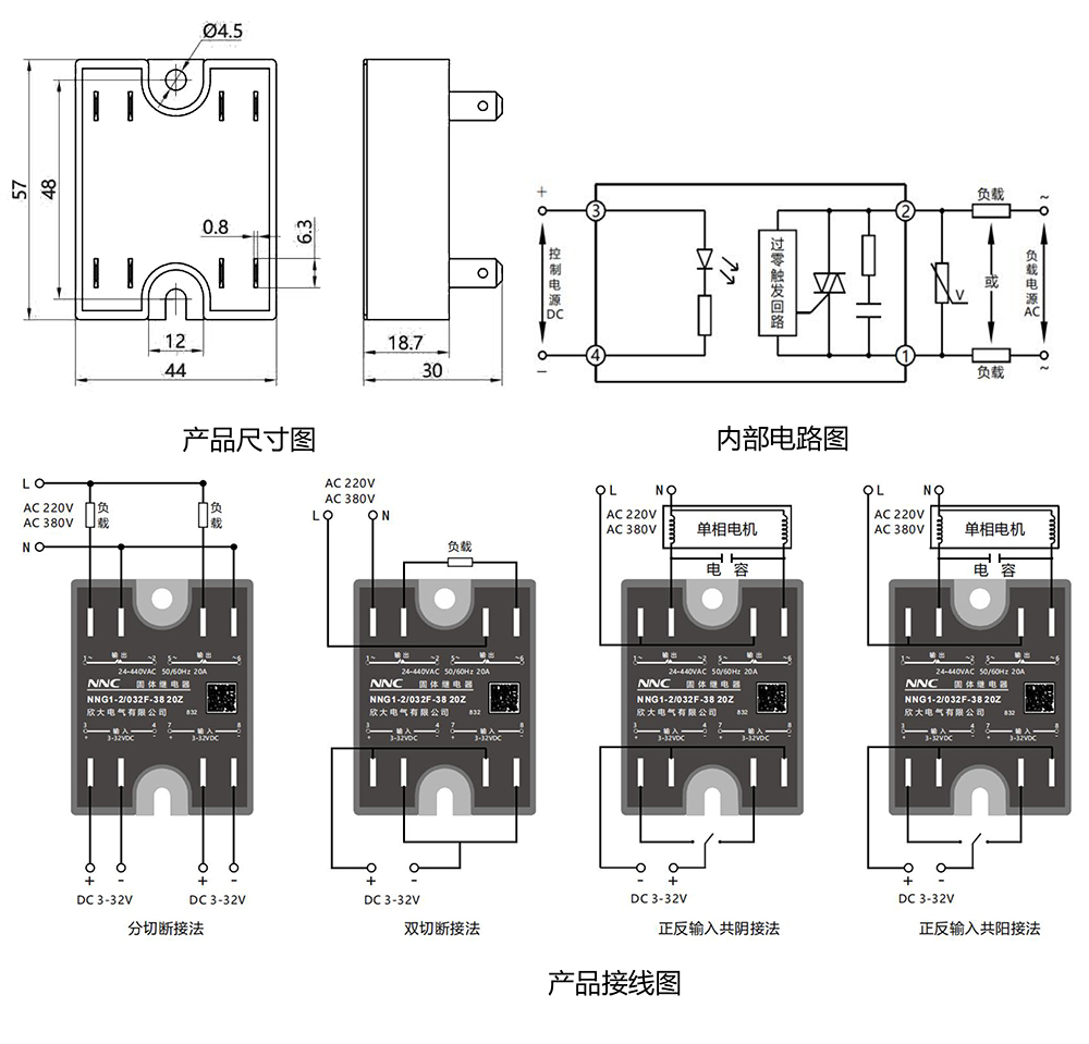 瞬態電壓 22:600VAC 38:900VAC 通態壓降 ≤1.6VDC 通斷時間 ≤10ms 斷態漏電流 ≤10mA 介質耐壓 ≥2500VAC 絕緣電阻 100MΩ,500VDC 測試 環境溫度 -30~80℃ 安裝形式 螺栓安裝 產品重量 ≈83g 外形尺寸 57×44×30mm 說明 負載5A 以上必須安裝散熱器,60℃以上必須加風扇強冷或者水冷 產品尺寸及接線方式
