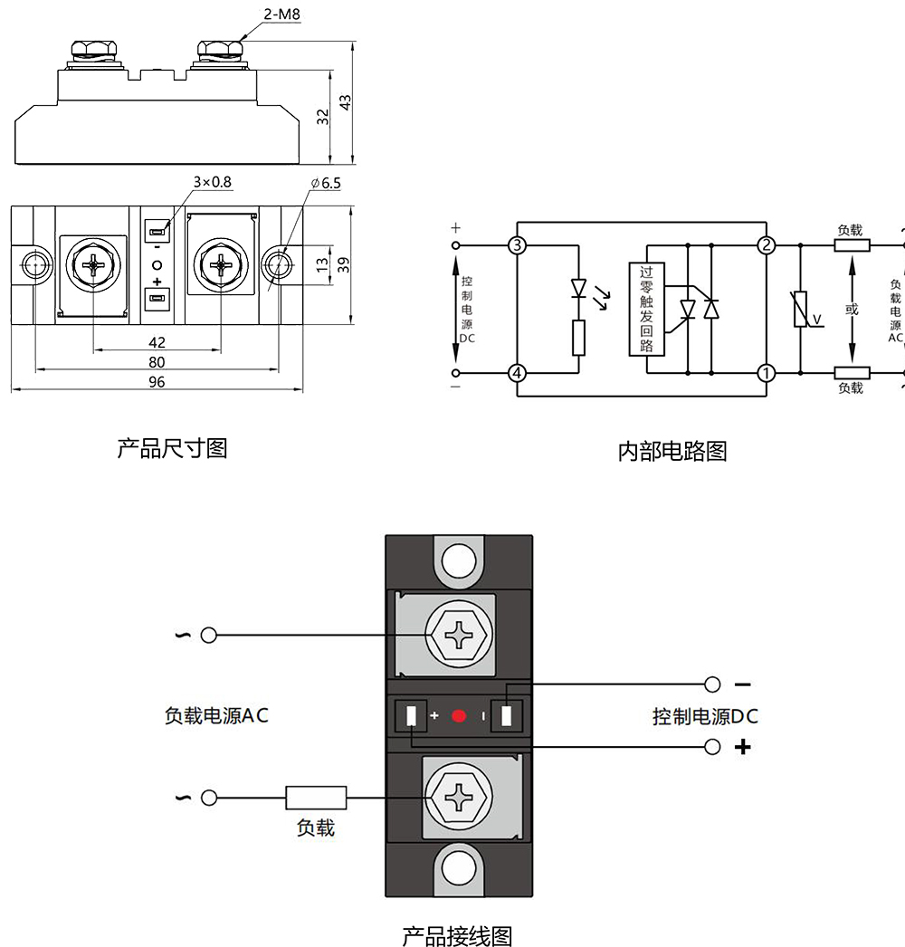 ①安裝時請務必在電源側加裝aR 型快速熔斷器,空氣開關等保護,以防止短路,造成產品永久性失效。選取熔斷器電流等級的原則為略大于負載電流。阻性負載和感性負載宜用aR 型快速熔斷器,電動機,電力補償電容器類負載宜用空氣開關保護。