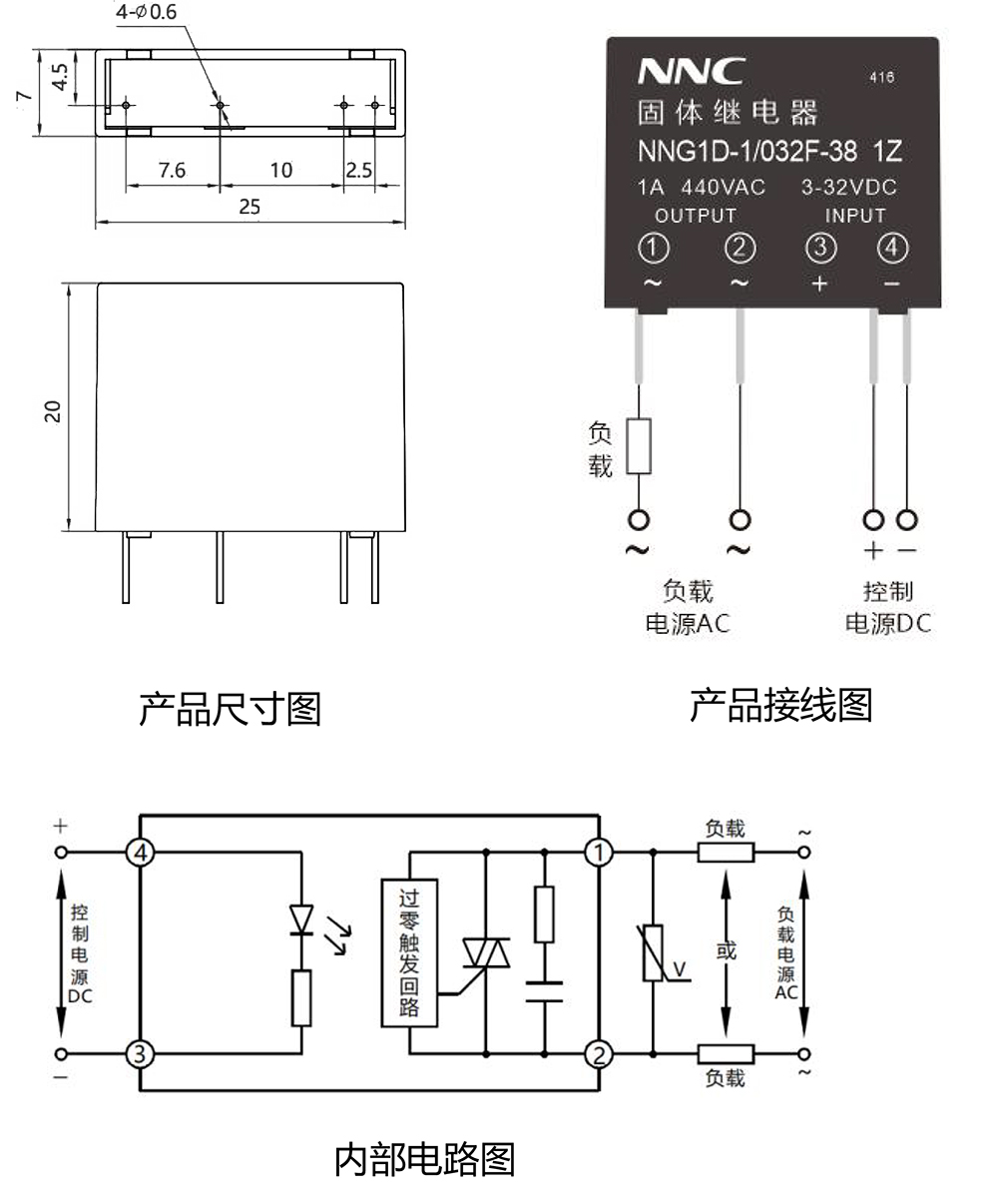 產品技術參數控制電壓 3-32VDC 控制電流 6-25mA 接通電壓 3VDC 關斷電壓 1VDC 反向電壓 32VDC 負載電壓 22:24-240VA 38:24-440VAC 負載電流 1A、2A