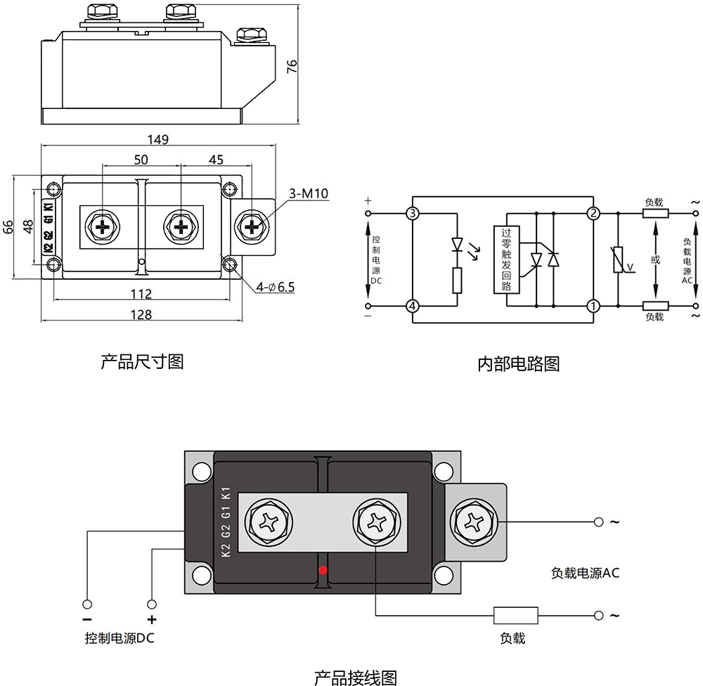 ① 安裝時請務必在電源側加裝aR 型快速熔斷器,空氣開關等保護,以防止短路,造成產品永久性失效。選取熔斷器電流等級的原則為略大于負載電流。阻性負載和感性負載宜用aR 型快速熔斷器,電動機,電力補償電容器類負載宜用空氣開關保護。