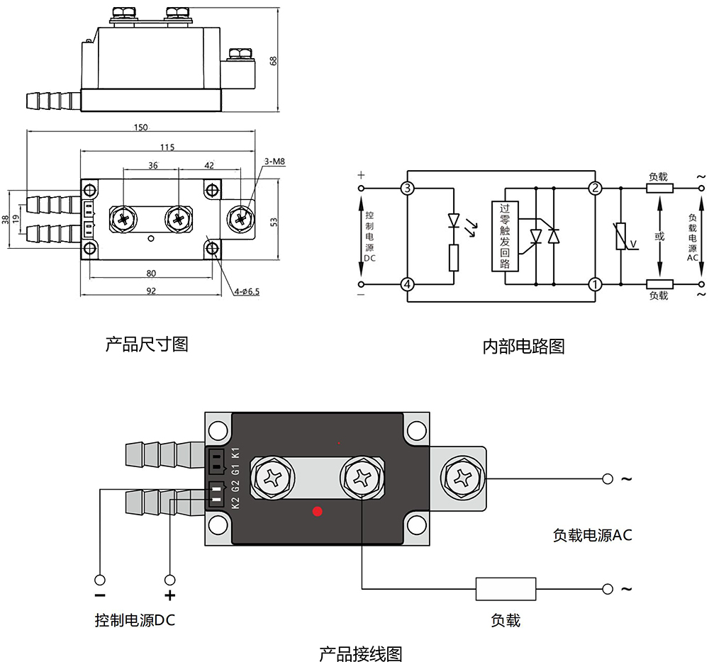 ① 安裝時請務必在電源側加裝aR 型快速熔斷器,空氣開關等保護,以防止短路,造成產品永久性失效。選取熔斷器電流等級的原則為略大于負載電流。阻性負載和感性負載宜用aR 型快速熔斷器,電動機,電力補償電容器類負載宜用空氣開關保護。