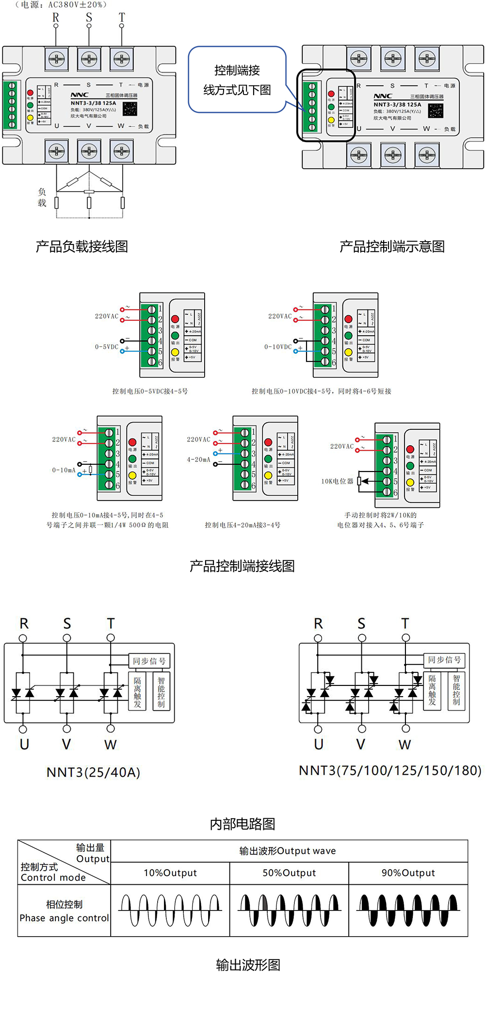 本產品是將晶閘管觸發電路,單片機控制移相電路、信號檢測傳感電路,電壓調節電路 封裝在一起的智能集成模塊。是一個完整的電力移相開環控制系統,可實現對負載電壓的調 控。內置RC 阻容吸收回路及壓敏電阻保護,DC0-5V/DC0-10V/DC1-5V/4-20mA 等信號 兼容,也可用手動控制,在信號控制作用下,實現三相負載電壓從0V 到電網全電壓的無級可 調。采用線性控制電路,精度高,穩定性好。廣泛應用于工業電爐、玻璃熔爐、烘箱、石油 化工、鞋機等加熱行業,為了確保正確安裝及操作本控制器,請在使用前仔細閱讀此說明書; 可實現手動、自動控制接口,主電路交流輸入無相序要求。