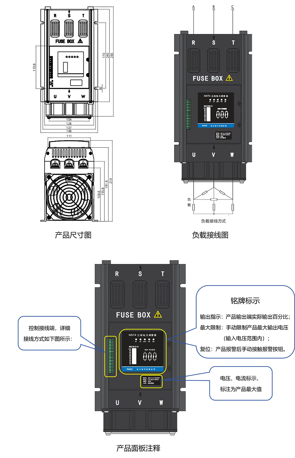 產品技術參數控制方式 DC 0-5V、DC0-10V、DC4-20mA、10KΩ手動電位器,四種方式可選 輸出方式 相位輸出、移相范圍0-150° 調壓范圍 200-440VAC 負載電壓 三相380VAC(三相三線) 負載電流 125A、150A、200A 保護功能 aR 型快速熔斷器 報警功能 斷相和超溫報警,繼電器輸出(1A/250VAC) 隔離電壓 有源型全隔離 介質耐壓 ≥2000VAC 輸出端-散熱板 顯示功能 LED 面板顯示SCR 輸出百分比及工作狀態指示 使用負載 定阻抗電熱絲、IR 遠紅外線、UV 燈管等 環境溫度 溫度-10~55℃濕度90%RH 以下 產品重量 ≈6000g 外形尺寸 285×148×210mm 安裝尺寸 137×170mm 安裝形式 螺栓安裝 冷卻方式 強制風冷 產品尺寸及接線方式