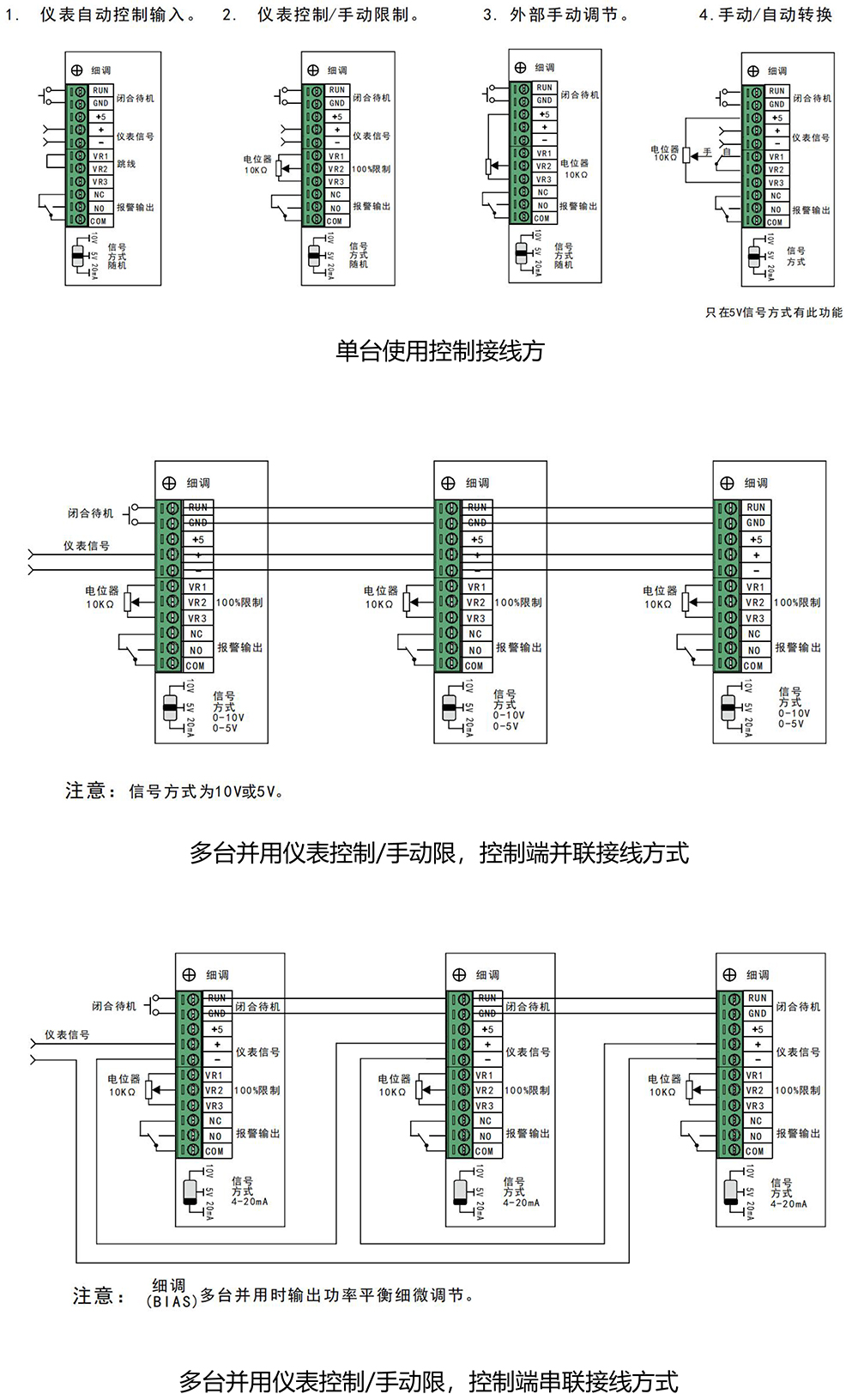 ⑨先選擇控制信號和控制方式,本調整器出廠設定控制信號模式(4-20mA),要更改設置將紅色蓋揭開,撥動里面波動開關選擇所需模式。按接線范例接線安裝好。多臺調整器同時或分段調節時,使用同一信號負載功率不一致,可調節細調來補償。注意事項