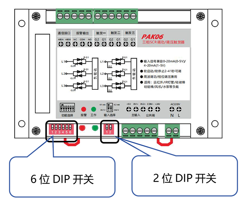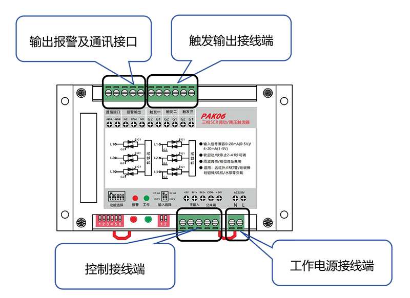 PAK06 具有3 路觸發輸出,端子觸發一、觸發二、觸發三分別觸發三路可控硅。