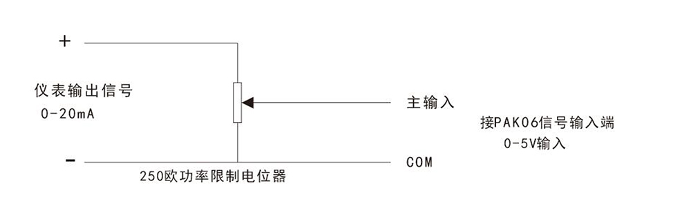 如需要限制輸出又不想采用電流反饋形式時,也可在儀表和PAK06 之間增加一個電位器來手動限制功率,如用于硅鉬棒、硅碳棒等高溫電爐,電位器阻值為250 歐,功率應大于1/2W,儀表用0-20mA 輸出,PAK06 選0-5V 輸入。接線圖如下:
