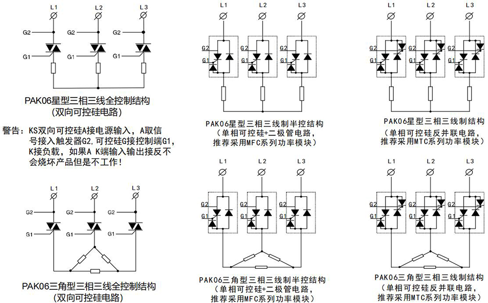 注:PAK06 的觸發輸出G1、G2 具有方向,同時N、L 端為電源零線/相線不可接反,