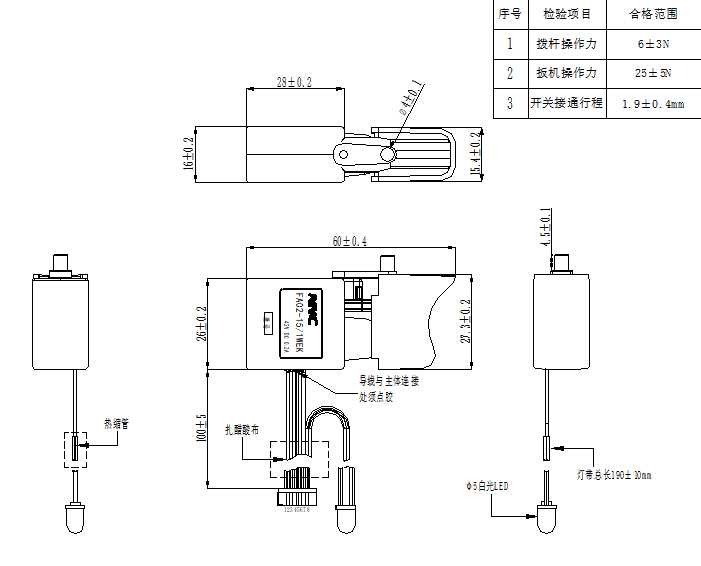 1.5 環境特性序號 項目 規格 1 操作力 25±5N 2 換向操作力 6±3N 3 接通行程 1.9±0.4mm 4 電位器起始行程 2.9±0.4mm 5 電位器終點行程 5.7±0.4mm 6 全行程 8.0±0.4mm 7 抗振動要 X,Y 方向掃頻范圍為 30~2000Hz,定加速度 15G,各 2h;Z 方向掃頻范圍為 30~1200Hz,定加速度 15G,共 2h,總計 6h;NO 通斷、VR 調阻及換向 F/R 等波形,掉波時間不超 8 機械壽命 100,000 次(20次/min),每次松開扳機換向操作一次;試驗后檢測VR調阻及F/R換向等波形,掉波時間