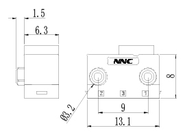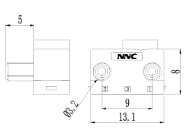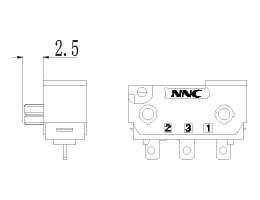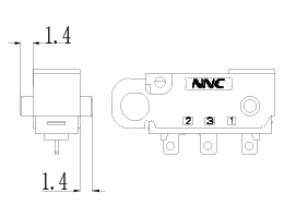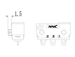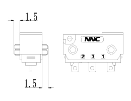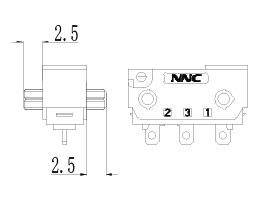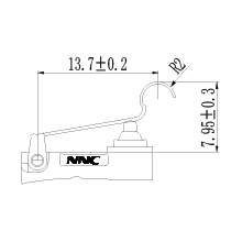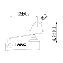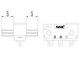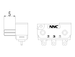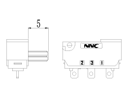 型號 額定電壓 額定負載 壽命 NFW5-□1: AC 250V 0.1A 1E5 DC 48V 0.1A 1E5 DC 12V 3A 1E4 NFW5-□2: AC 250V 3(1)A 1E4 DC 36V 3A 1E4 DC 12V 3A 1E5 驅動桿類型