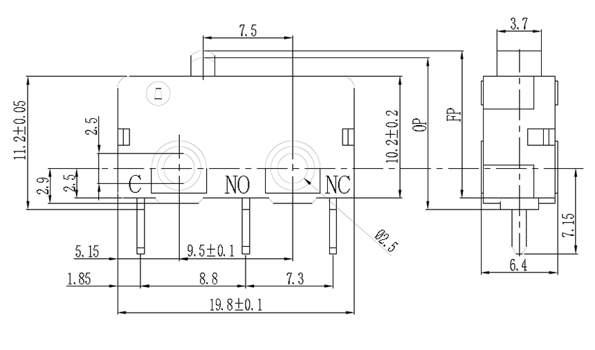 NL-5-F2D-H001OF 動 作 力 2.0±0.5N RF 釋 放 力 最小0.55N PT 工作行程 最大0.6mm OT 超越行程 最小0.6mm MD 差動行程 最大13.4mm OP 動作位置 12.75±0.2mm