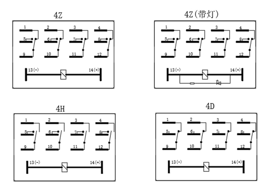 ⑤ 觸點形式:4H= 4組常開型 H; 4D= 4組常閉型 D; 4Z= 4組轉換型 Z
