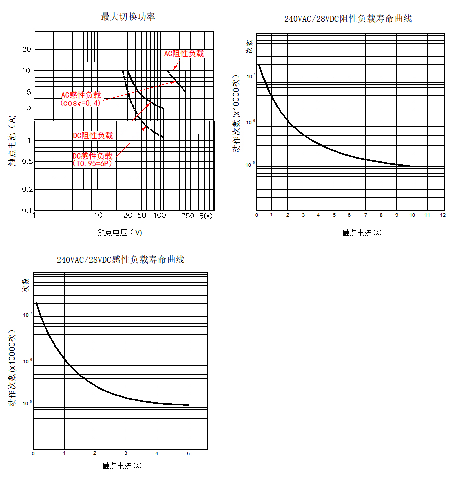 觸點類型 2C(Z)-轉換 2A(H)-常開 2B(D)-常閉 接觸電阻 100mΩ以下(在6VDC 1A條件下) 觸點材料 銀合金 觸點額定負載 10A 240VAC 最大切換電壓 240VAC/28VDC 最大切換電流 10A 最大切換功率 2400VA/280W 最小切換負載 5V 10mA 電氣耐久性 阻性負載, 10萬次以上 機械耐久性 1000萬以上 特性參數