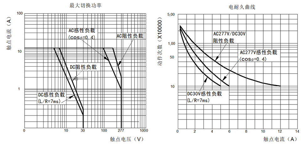 認證類別 CQC UL TUV 證書號 CQC22002357184 E235027 R50558307 負載要求 277VAC/30VDC 277VAC/30VDC 277VAC/30VDC 性能曲線圖