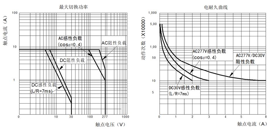 認證類別 CQC UL TUV 證書號 CQC18002194298 E235027 R50390940 負載要求 277VAC/30VDC 277VAC/30VDC 277VAC/30VDC 性能曲線圖