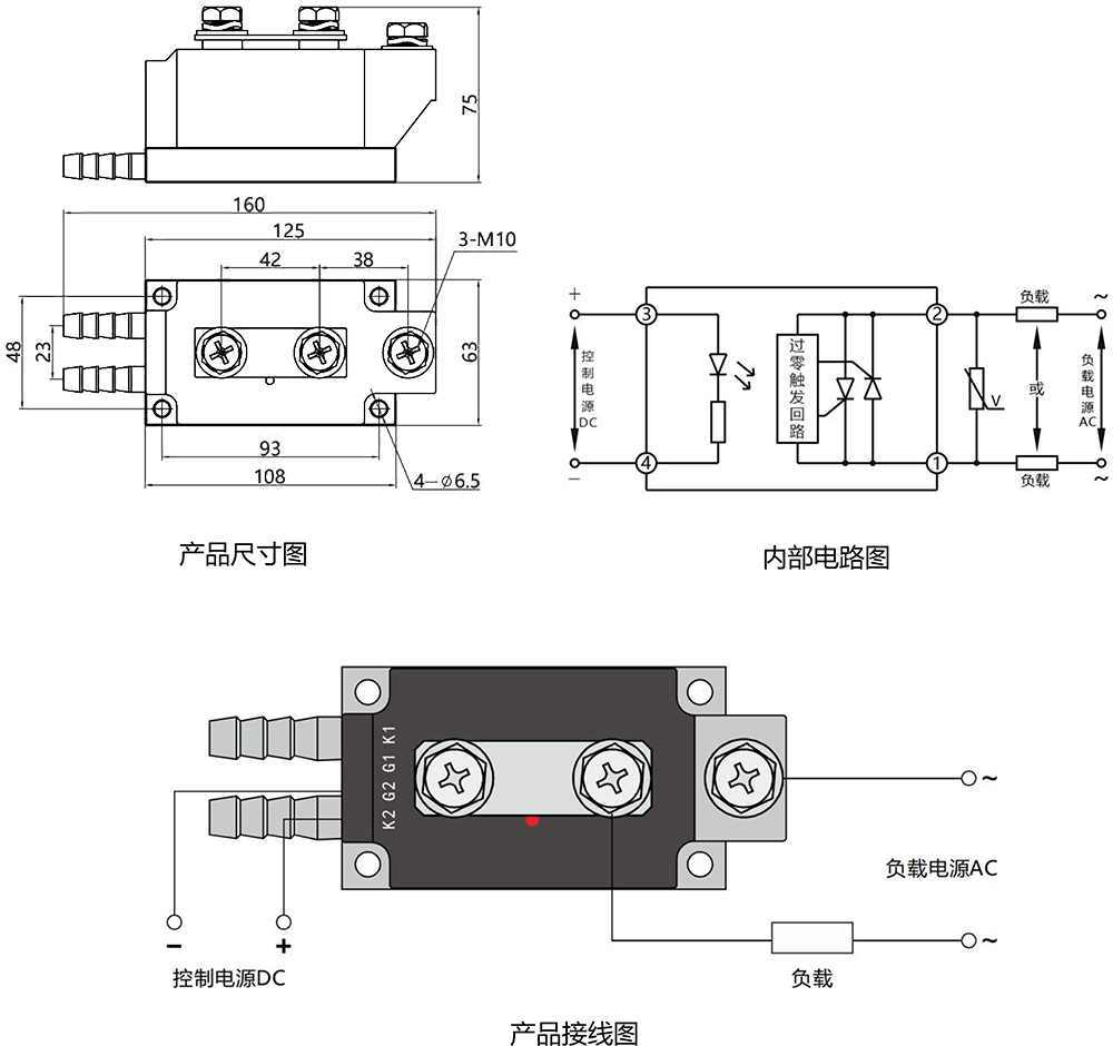 產品技術參數控制電壓 3-32VDC 控制電流 5-25mA 接通電壓 3VDC 關斷電壓 1VDC 反向電壓 32VDC 負載電壓 60-1200VAC 負載電流 800A 瞬態電壓 1600VAC 通態壓降 ≤1.6VDC 通斷時間 ≤10ms 斷態漏電流 ≤10mA 介質耐壓 ≥2500VAC 絕緣電阻 100MΩ,500VDC 測試 環境溫度 -30~80℃ 安裝形式 螺栓安裝 產品重量 ≈1740g 外形尺寸 160×63×75mm 安裝尺寸