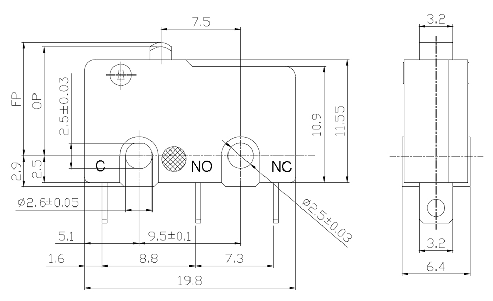 動作特性\型號 NS-102MP NS-52MP 動作力 OF最大 2.2N 回復力 RF最小 0.3N 預行程 PT最大 1.0mm 過行程 OT最小 0.5mm 響應差行程 MD最大 0.2mm 自由位置 FP最大 10.8mm 動作位置 OP 10±0.5mm