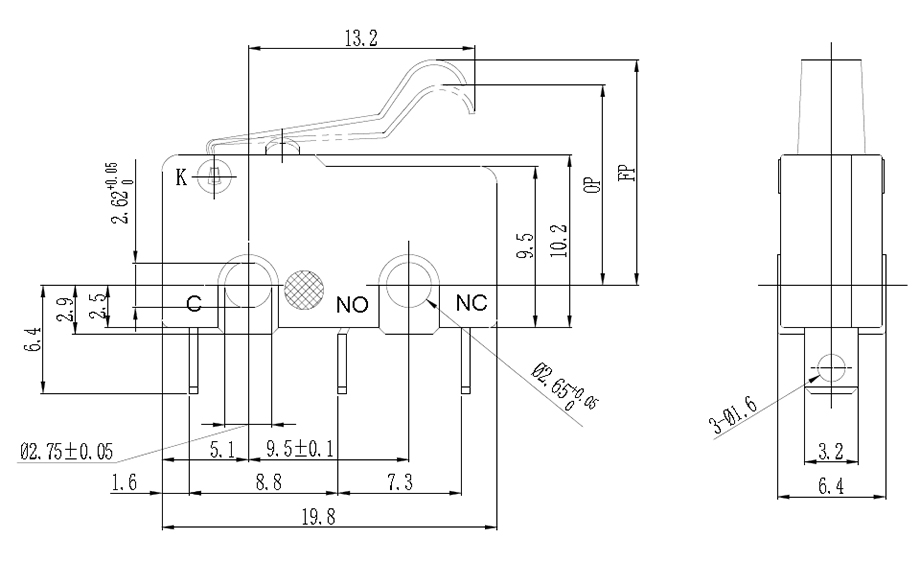 動作特性\型號 NS-5W8-HR5001 NS-10W8-HR5001 OF 動作力 最大0.55N RF 釋放力 最小0.08N PT 工作行程 最大16mm OT 超越行程 最小1.2mm MD 差動行程 最大0.8mm OP 動作行程 13.4±1.2mm
